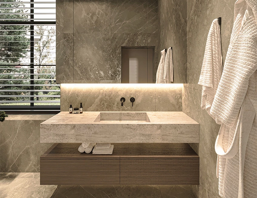 To cater to different storage and hygiene needs, this bathroom features a side-opening mirror cabinet and a countertop with separated drawer base. The floating structure and cohesive color scheme lighten the visual weight, which allows the room to feel still expansive. The wide size accommodates the users comfortably—also an intentional response to the generous space and large window.