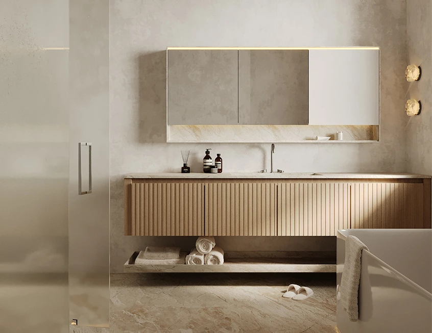 This vanity embraces a sleek floating form that maximizes floor space while delivering a light, airy presence. The fluted cabinet front adds subtle rhythm and texture, softening the clean lines and giving depth to the design. A recessed shelf below provides convenient towel storage, keeping daily essentials within easy reach yet visually organized. Paired with a frameless mirror cabinet featuring concealed storage and a seamless integrated sink, the design achieves both elegance and functionality.