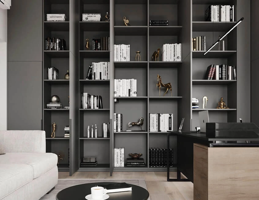 This home office carved out of living area benefits from the comfort and contributes to a more convenient, versatile home space. It has been designed with a powerful storage bookcase and desk with drawers. The design processes a focus on modern minimalist aesthetics and opted for matte dark grey and walnut finish to complete the look.