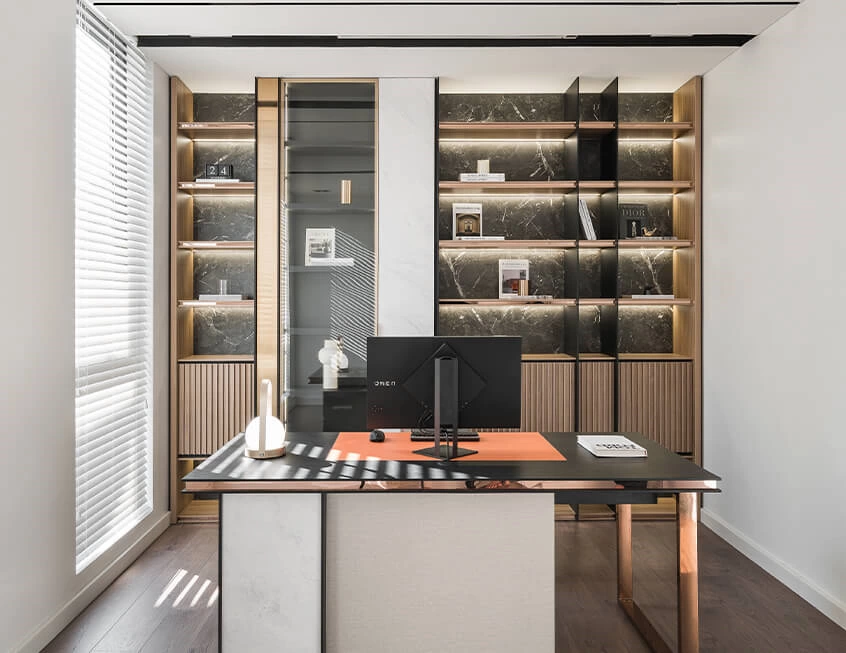 It’s simple in color, yet you can feel the richness in texture and styling details by the beautiful mix and match of the genuine wood and stone. This bookcase also features open shelves with recessed lighting stripes, which can keep your books, files clearly organized and collections perfectly on display.