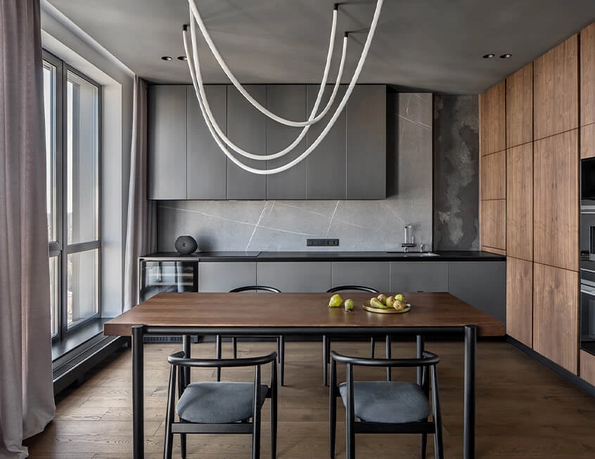 Striking shades of grey create an impactful aesthetics in this contemporary home. Wood elements and black accents well complete the interior look.