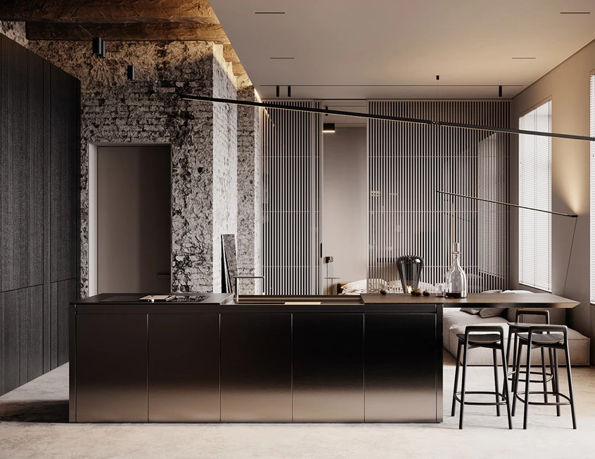 A unique light of great length steadily leans aside but seems to have taken center stage.Artificial brick walls create a wild and raw feel,which is softened by super-sleek island and cozy sofa. Shelves instead of cabinets add more lines,while in the bathroom,combination of lighting,the round mirror,cabinet and shelves on the wall drives geometric aesthetics to the max.