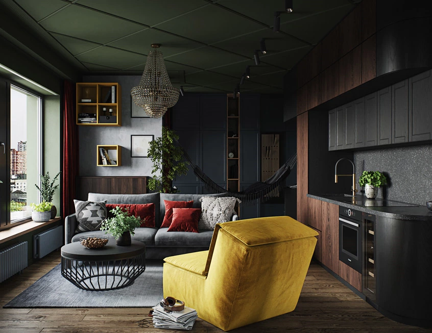 There’s so much to explore and love in this panoramic jungle house.it's quirky, upbeat, and unique without being too flashy.Floating cabinets and shelves in the bathroom alleviate the bulky, damp feel of dark green.All-wood grain kitchen cabinets create a rustic foundation,while glass doors add a modern touch to the space.Cabinets of different designs keep things in storage or on display never boring.