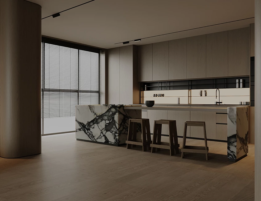 Design led whole house custom cabinetry in warm wood veneer, marble and lacquer, with discreet storage and neutral tones; share your floor plan for a quote.