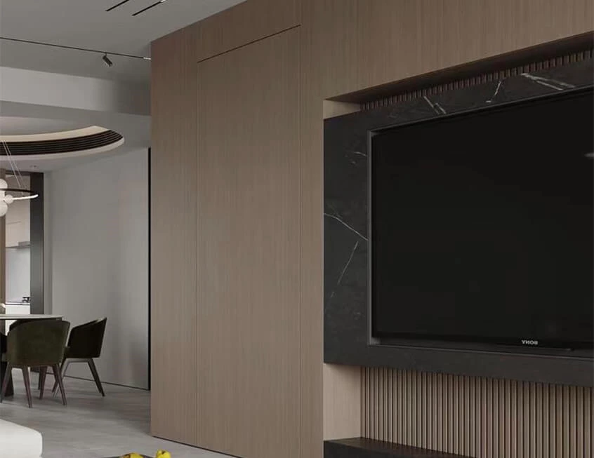 The pivot-style invisible wooden door boasts a remarkable panel layout that eliminates the need for handles, seamlessly blending the door into the wall. This design not only offers exceptional privacy to personal spaces but also contributes to the overall effect of modern minimalistic home.