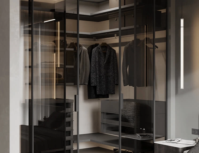 The combination of minimalist black frames and glass sliding doors creates a sense of transparency and lightness in the space, as compared to solid wood doors. Acting as a visible partition, it allows for a clear view of the interior of the walk-in closet while also blocking out dust. The floorless track design not only enhance aesthetics but also facilitate easy cleaning in daily maintenance.
