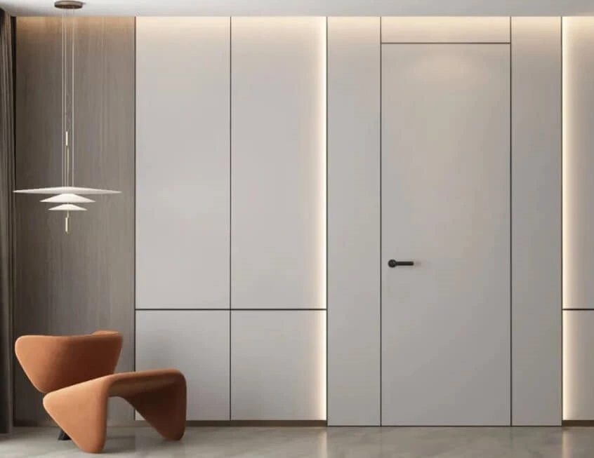 Incorporating the essence of modern minimalism, white wood doors are designed to seamlessly merge with the background wall, creating a unified and tranquil ambiance of pure serenity.