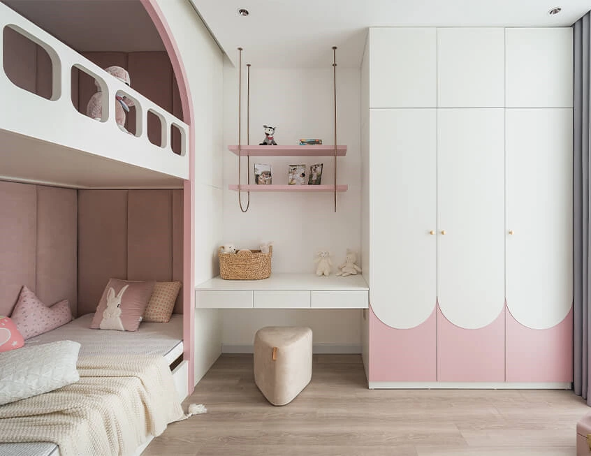 This girls' room uses a girly pink-and-white palette and it is eye-pleasing while pairing with more modern, streamlined custom storage units. Geometric styling details add more funny factors to the space without going overboard. Shelves and shaped cabinet openings can showcase knickknacks and toys.