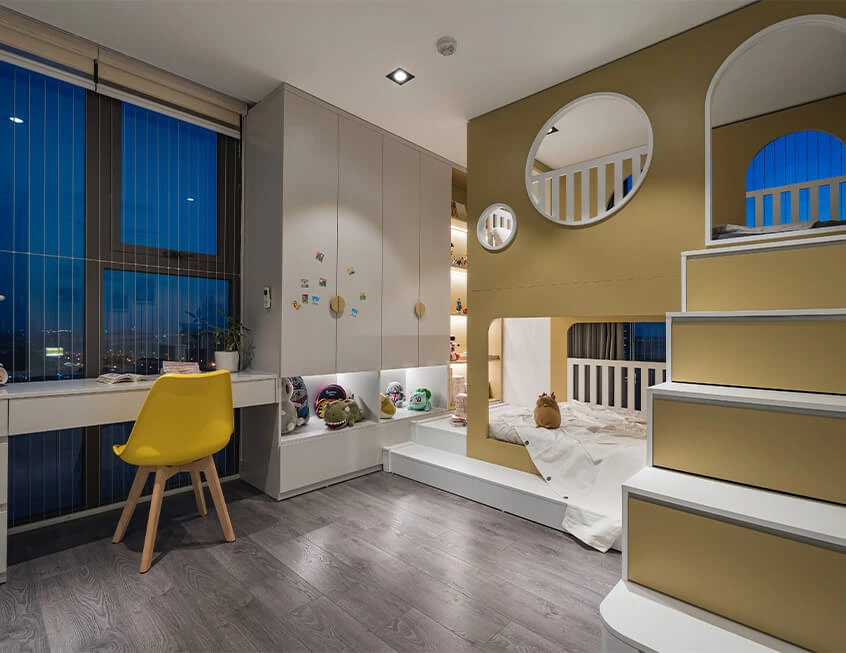 Utilize vertical space to craft a large double-decker bed, which provides ample room for activities but also enhances safety and amusement. The stair doubles as drawer cabinets for extra storage. Integrate the study desk, wardrobe, and display cabinet into a continuous unit, which gives the space a more cohesive look and better meets the diverse functional needs of children. The overall design and color scheme create an uncluttered environment that help foster concentration of the children, yet visually appealing.