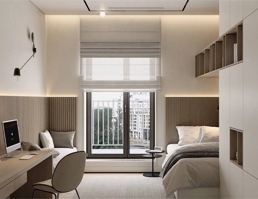 Floor-to-ceiling storage unit integrated with desk and bench get everything neat and harmonious, while open sections makes it possible for your kid to plan their room in particular as individual. Soothing colors and highly decorative fluted wainscoting characterize a relaxing living space for a kid's growth.