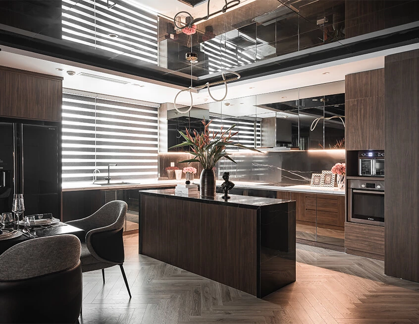 A spacious and expansive L-shaped cabinet layout with an island counter provides ample storage space and a seamless workflow, creating an ideal environment for daily food prep and interaction. The dual finish of mirrored glass and deep walnut wood grain, complemented by the natural textures of black and white sintered stone, showcases a harmonious blend of nature and contemporary luxury. The incorporation of mirror panels not only adds a touch of opulence but also enhances the kitchen's sense of space, making it appear larger and brighter.