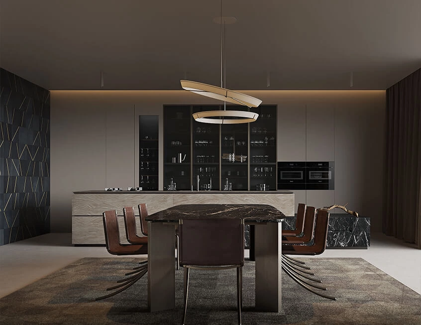 The large island could be the first to impress you in this kitchen. It’s huge and grounded featuring surfaces of two different textures and colors, which anchors the whole space and bridges kitchen cabinetry and diner area. The tall cabinet units integrated glass and matte finishes. It creates a soothing visual flow and gives a powerful modern touch.