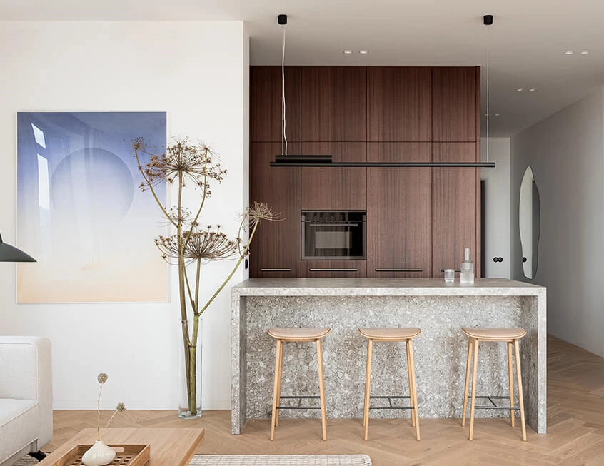 This kitchen makes a bold, vibrant statement in the space with a beautiful palette of reddish wood, white, black and limestone grey.