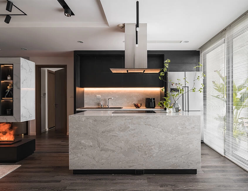The highlight, black wood cabinet sets this contemporary apartment kitchen. Island and backsplash consisting entirely of polished quartz stone add a vivid contrast and more organic touches. Touch open doors provide a sleek, streamlined appearance. Double tier wall cabinets optimize the vertical storage space utilization.