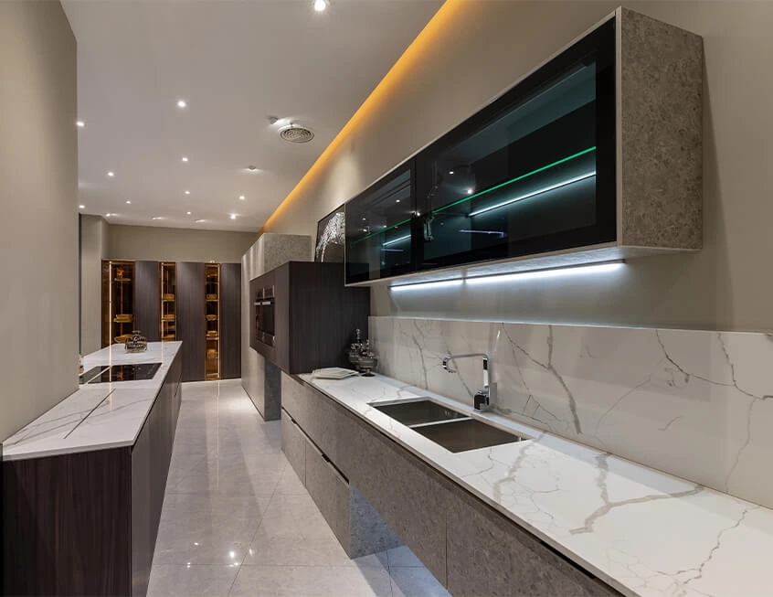 This kitchen design is based on two parallel runs of units to form a central corridor, which works well in small, narrow or medium-sized spaces. Cabinet irregular unit designs add some interesting aesthetics to the kitchen. Decorative high-pressure laminate, or HPL, which is from Formica, contribute to the texture-rich look, while glass-fronted door add a modern touch. Contrasting sintered stones create a simple yet stylish mixed countertop. You can work on the white counter and designate the black one as the dinning area. The built-in pantry with worktop. Interior shelving and extended drawers keeps everything at sight and easily accessible. The side cabinet incorporates glass display storage and closed storage, which shows design flexibility.