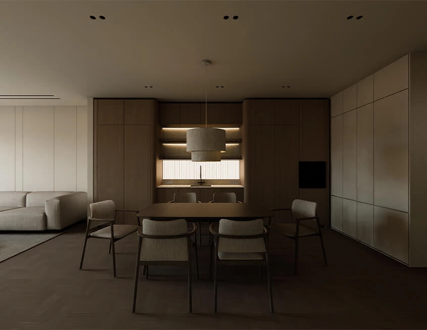 Handleless white and oak cabinetry paired with travertine sintered stone countertop highlight the natural harmony and the comfort of home with curved corners and acrylic lighting backdrop to enhance the effect. Shelving are incorporated for specific display or handy storage.