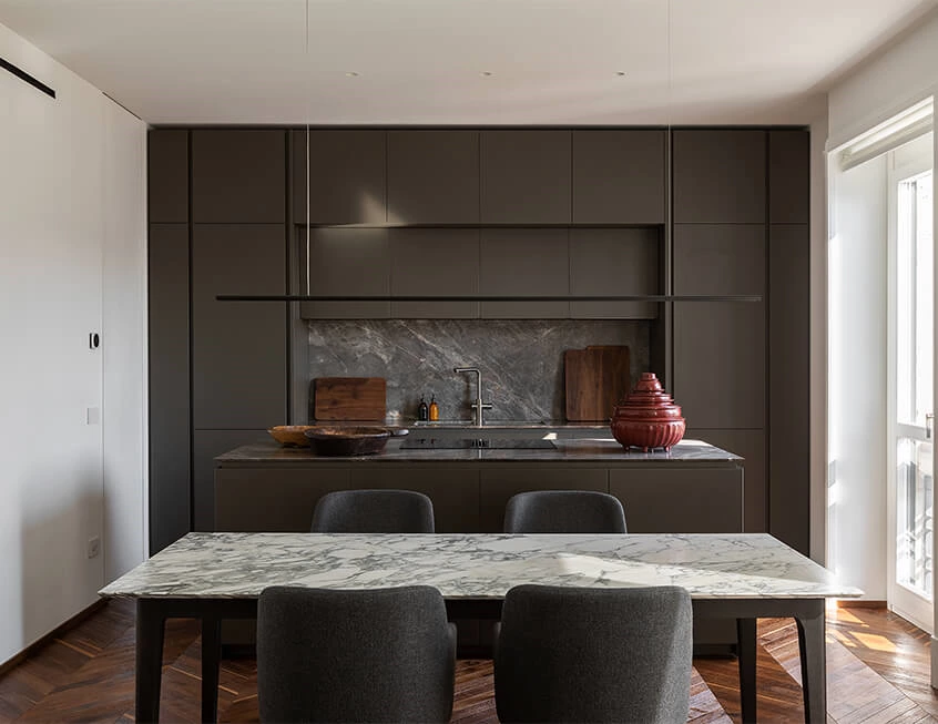 It’s rich in grey tones, from the matte dark grey cabinetry, to the backsplash and countertops made of lighter grey marble-look quartz with imposing white veining.