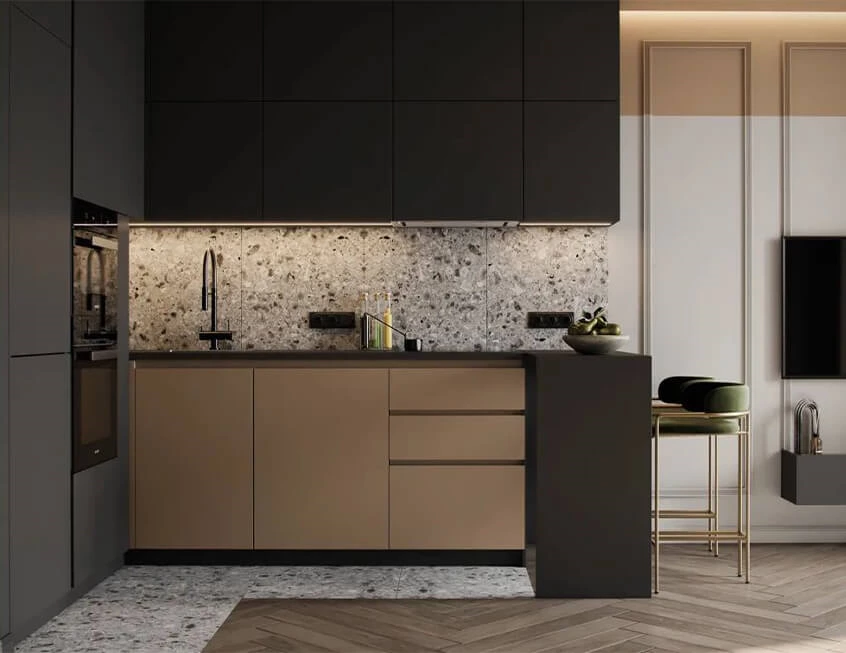 Designer opted for saturated black and earth-toned for the cabinets, to craft a kitchen space that make you feel reliable and comfortable.