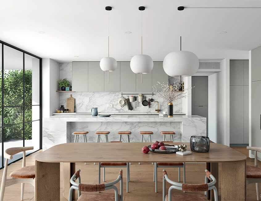 If you want a modern, unsophisticated kitchen, take note of this minimalist cabinetry in a pastel grey green with white marble countertop. The rich sheen of the hardwood elements draw the eye and lends a feeling of warmth to the space.