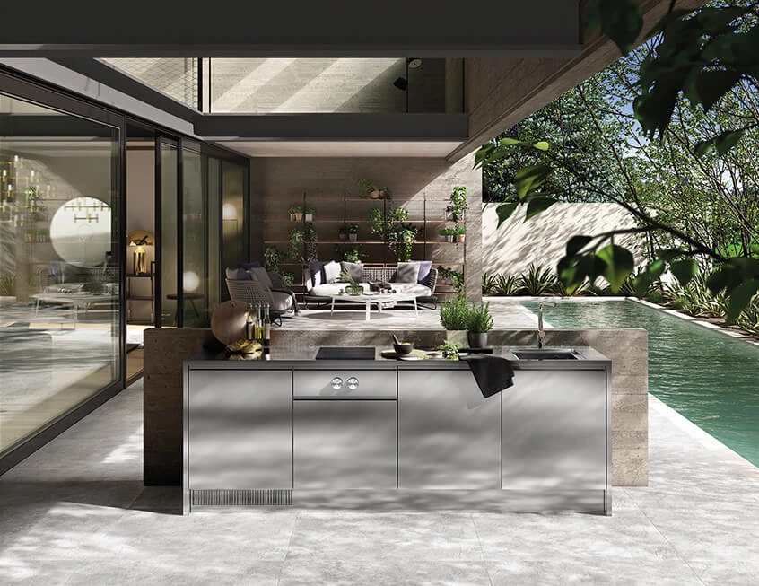Whether you are planning an indoor or outdoor kitchen, stainless steel kitchens tend to stand the test of time both in quality and aesthetics. The cabinets have integrated handles on the top for a minimal look that is finished off with a stainless steel countertop and faucet. The organic natural scenery outdoor create a strong contrast with the clean, sharp lines of this minimal cabinets.