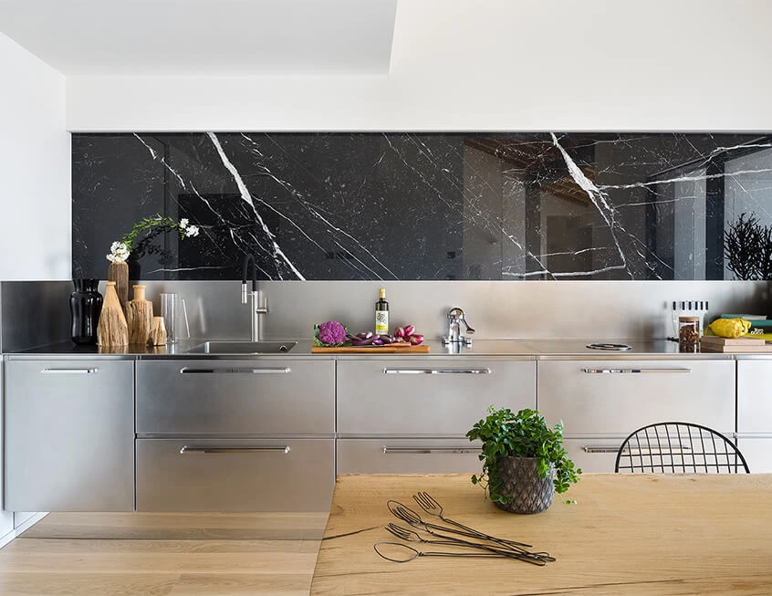 A captivating contrast merging the industrial charm of stainless steel with the sophisticated allure of high-gloss black sintered stone. This combination adds depth and visual interest to your kitchen design, making it a standout feature in your home.