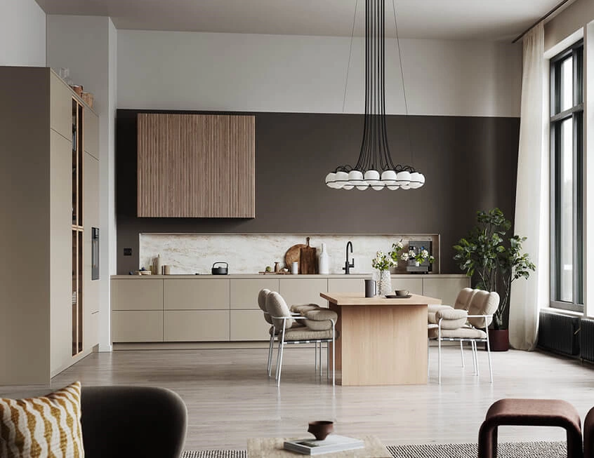 Handleless minimalist design, piling on the popular neutrals with different materials including matte lacquer, wood melamine and metallic frame, This kitchen really creates that modern and homey feeling. Drawer base cabinet allows further kitchen organization.