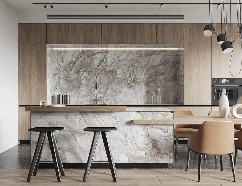 Not only does this combination enhance the kitchen's visual appeal, but it also makes it feel airy and open. Whether you're working or relaxing, the colors provide a calm, serene backdrop for your kitchen activities. The integration of natural wood tones with the marble accents is a perfect blend of modern luxury and classic warmth, creating a space that's both functional and beautiful.