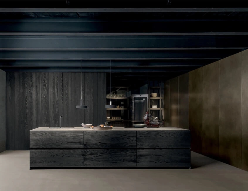 The cabinets of this large modern kitchen are highlighted by its dark material motifs. The rich texture of natural wood and stone draws the eye and lends a feeling of sophistication and depth to the space. Full-length cabinets with abundant closed storage and built-in appliances provide a more cohesive, streamlined look with less visual burden of cabinet volume.
