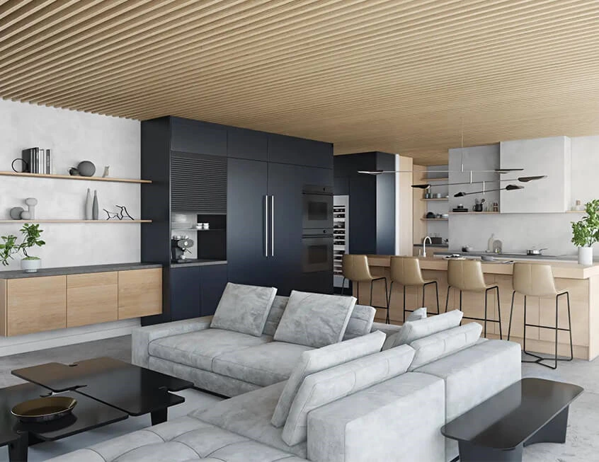 The wood cabinetry well blends in this open layout, with the rich sheen and horizontal wood grain lending a feeling of warmth to the kitchen space. Incorporate the black lacquer tall cabinet units to stand in contrast to the wood tones and the soothing soft dove-grey of the kitchen background. Open shelving instead of upper cabinets allows kitchenware to be displayed and also allow for ease of location. Pair with a sturdy wooden island bar to create a clean and inviting kitchen for home living.
