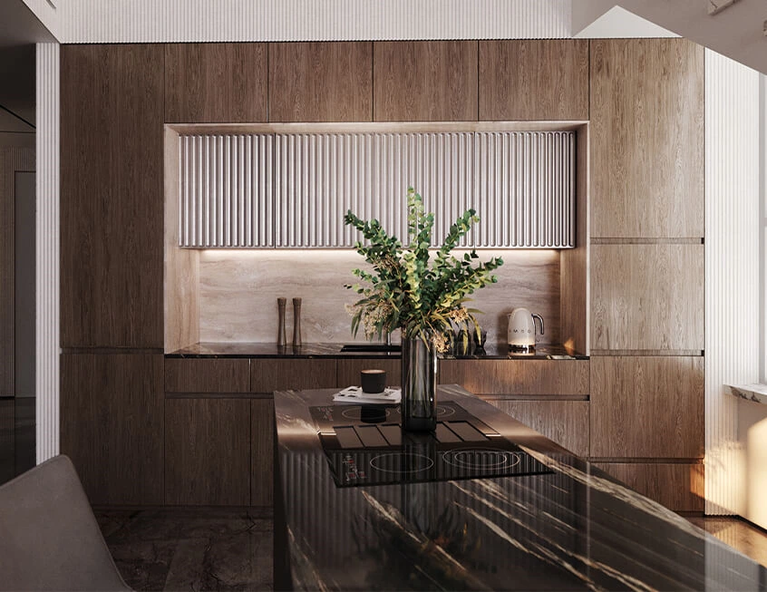 This kitchen is designed with a bold mix of texture-rich materials and create a luxurious feel to the space, with travertine sintered stone backsplash, mountain oak and metallic vertical ribbing details in the built-in storage unit. The polished marble island makes another fabulous statement—Eye-catching linear veining, a higher cylindrical bar at one end make it an enjoyment to have casual meals and conversation here.