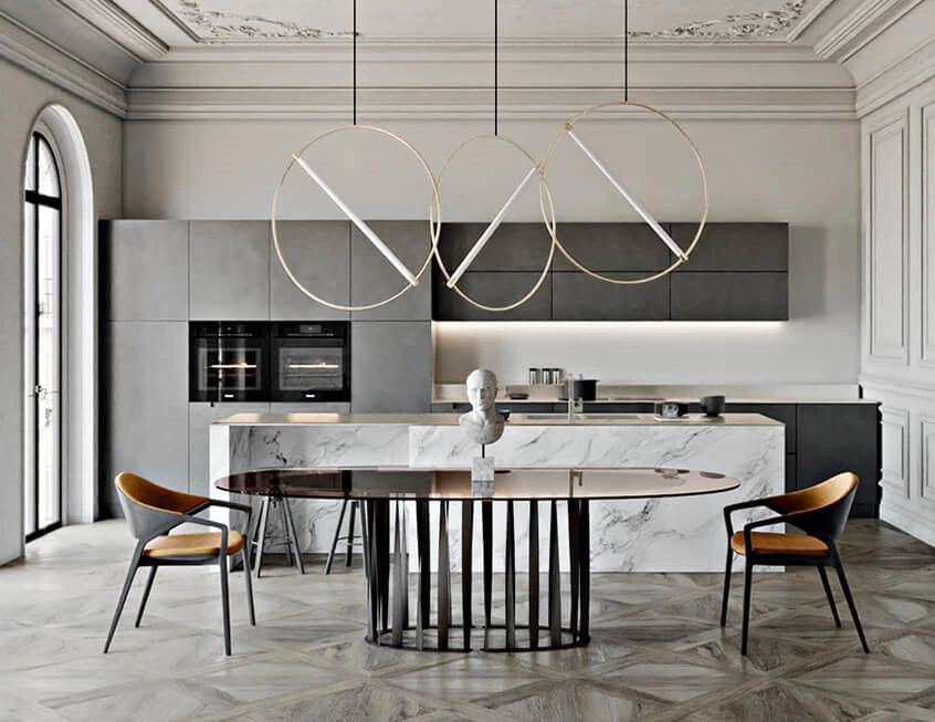 Gray and white two-tone design, dark gray cabinet finishes stand in a strong contrast with white marble island and countertops. The simple and concise color matching appears simple and simple, presenting a low-key modern open kitchen appearance.