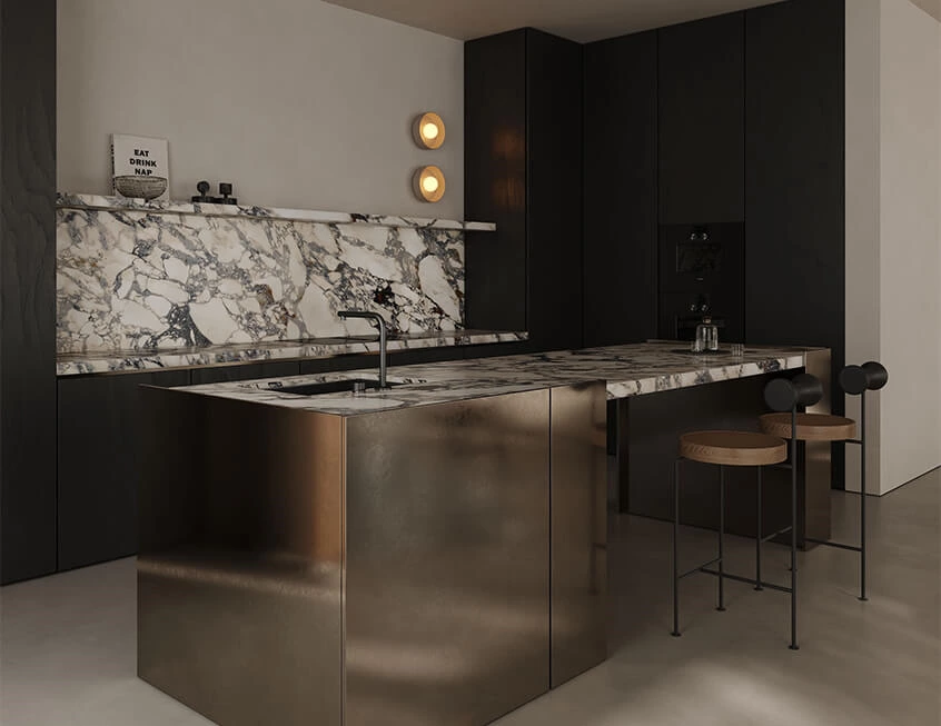 Black wood cabinets, marble counters and backsplash and the metallic touches from the island make this kitchen stand out without the need for added decor. Streamlined layout and handleless design work to maintain a balanced look. Open shelving allows to showcase personal favourite kitchenware.