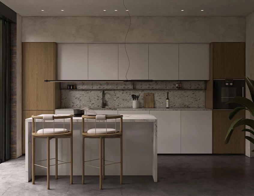 This is a stylish open kitchen sandwiched between the microcement flooring and natural scenery outside. Featuring clean lines and subtle texture on the marble waterfall island and the flat panel cabinets, an air of understated elegance without lots of effort.