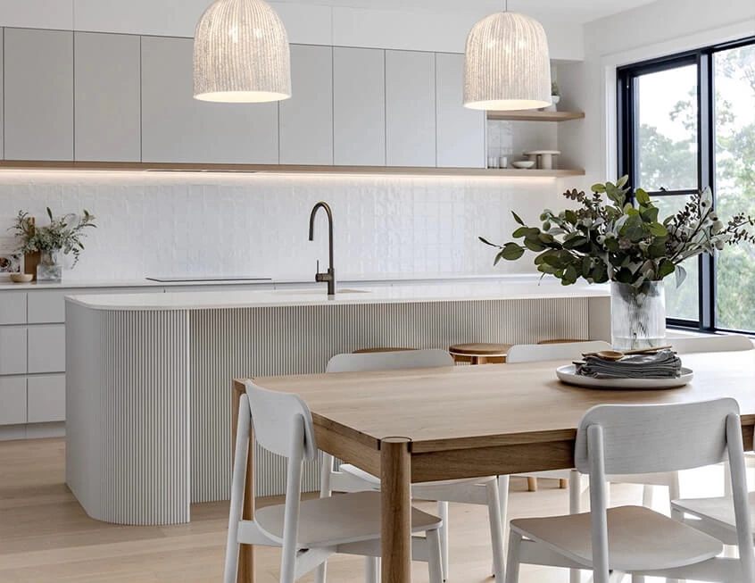 In this kitchen, the design details are everything. From the fluted island, curved corner, the soft, subtle cabinet hues to the oak wood elements, this kitchen is refreshing, simple, and visually pleasing. Besides, full closed storage and handleless design also contribute to a more streamlined, clutter-free kitchen look.
