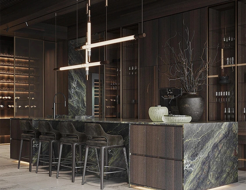 The combo of green marble with imposing veining and smoked oak wood really gives this kitchen that wow factor. Cabinets with gold metal framed glass door and internal lighting are made for splashy storage of kitchenware and wine collection.