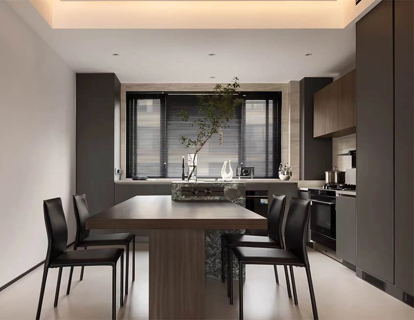 This modern eat-in kitchen outlines a streamlined, sophisticated look with flat-front cabinetry, understated tones and beautiful match of texture. The split-level unit of island and lowered dinning table create a focal point and serve for extra storage, work spot and dinning. Movable socket on the side of the island and glass cabinet add to the utilitarian feel that's still stylish.