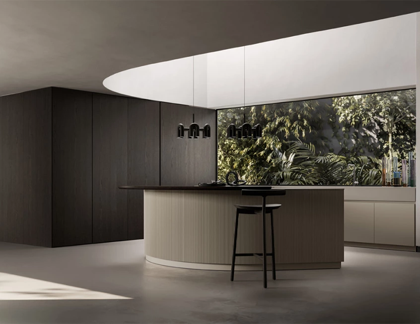This modern kitchen stands out with its soft curves, clean lines, and smart layout. The island takes center stage with a unique, rounded design that flows smoothly into a built-in dining area, ideal for casual meals or coffee chats. The balanced palette keeps things calm and cohesive, letting the textures and shapes take the spotlight. Vertical fluted panels add subtle texture and depth, keeping things interesting without being too loud.