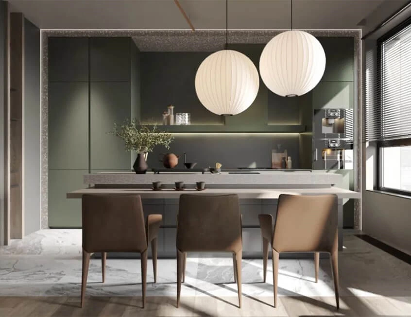 Create a modern kitchen with minimalist cabinet in a soft sage green and stone wood mix countertops, just like this design.