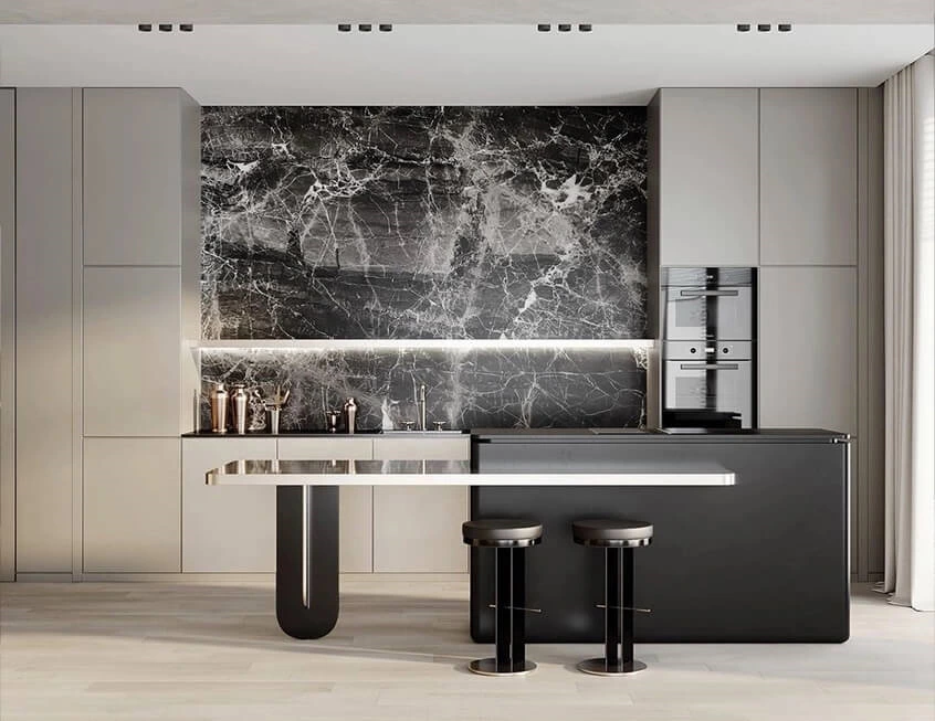 A modern minimalist styled kitchen cabinetry anchors the entire space under the shades of wisdom and calmness. Handleless cabinet doors and built-in appliances provide a streamlined look. Dramatic marble backsplash brings a strong presence of color and texture and adds depth to the kitchen. The island makes another statement of the style. The cool sheen of the extended metallic counter and the crossed island leg add some glam beyond cooking.