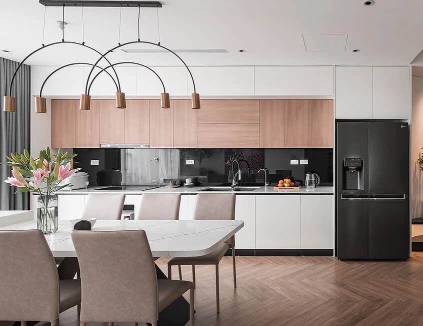 The combination of natural wood tone with soft white is a classic and easy solution to complement a home decor style that is modern minimalistic.