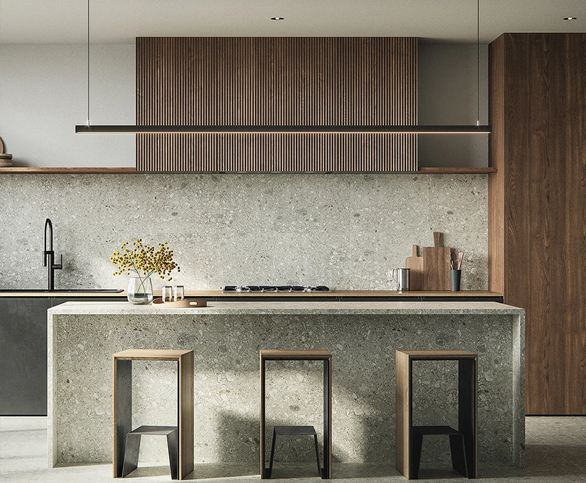 Corresponding with the backsplash,all quarts stone island might be unexpected but adds a rustic touch for this kitchen.Strengthen this effect with natural wooden texture,but embrace the modern with the black PET finish and grilling design.Simplify the upper cabinet by floating shelf,which tends to present your lovely servewares or items that show personality.The lighting and the guest seating are simple yet expressing sense of design.