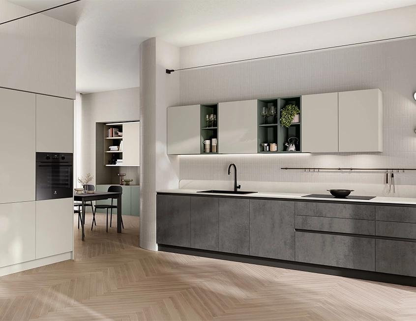 Muted shades of grey and ivory form the foundation, setting a sophisticated tone that feels timeless. Sage green accents introduce a soft, organic note, tying the kitchen to the adjacent dining area and lending an effortless continuity throughout.