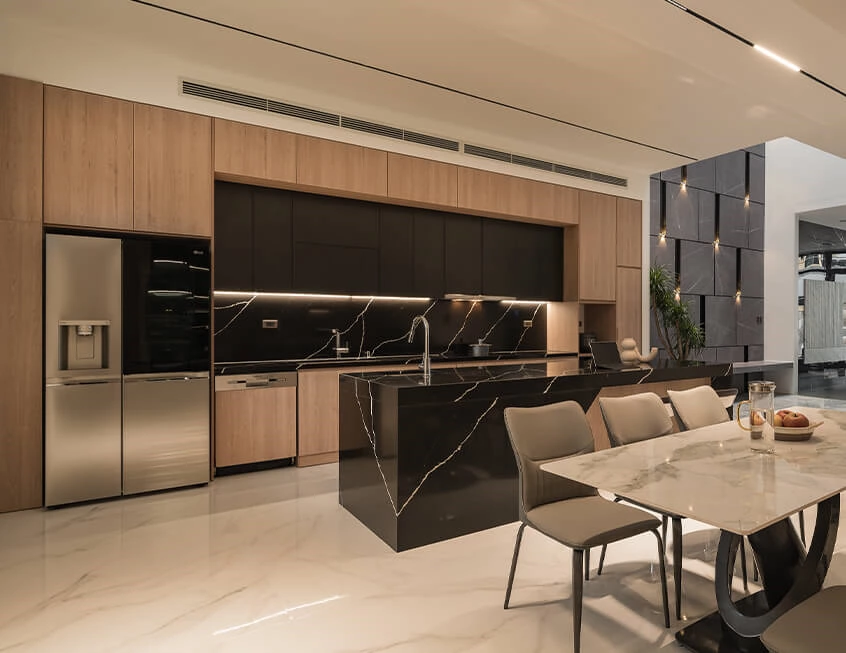 Wood finishes go throughout the kitchen and warm up the space, while rich black tone add some contrasting modern glam.
