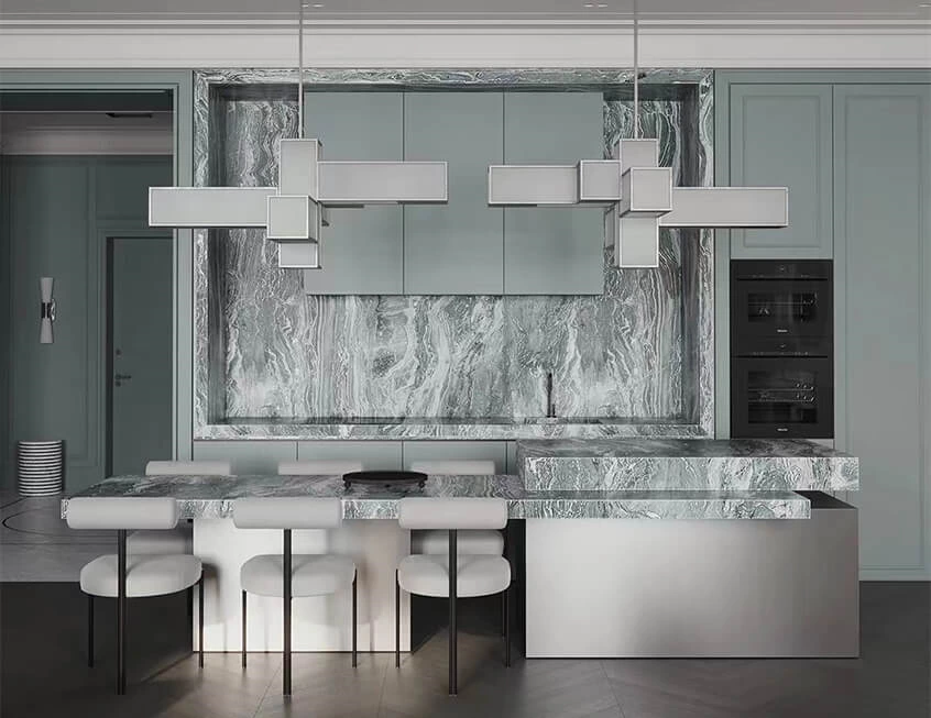 For a more cohesive kitchen look, designer paired the textural stone with a matching hue from morandi green spectrum.