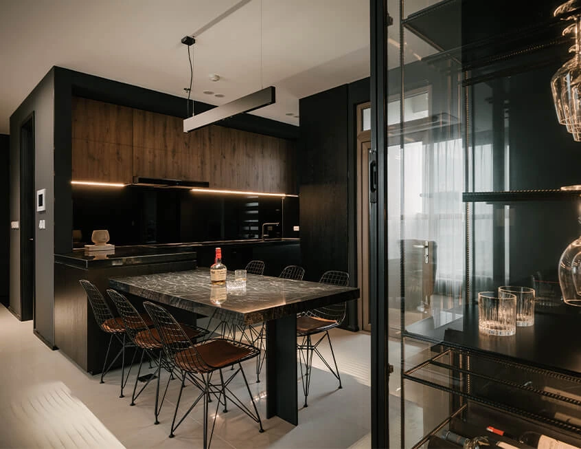 This open layout kitchen diner features a compact L-shaped kitchen cabinet, connected with the dining table, complemented by a dining sideboard and a floor-to-ceiling glass wine cabinet. Despite the limited space, the design still ensures a smooth workflow and creates an ideal interactive space. The overall cabinet design incorporates wood veneer finishes with varying tones, beautifully paired with the sleek black quartz countertop. The subtle and natural textures create a harmonious yet contrasting look, presenting a kitchen space with a touch of low-key luxury.