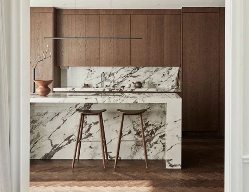 This kitchen celebrates warmth and tactility through its extensive use of natural wood cabinetry, which stretches across the walls in tall panels and seamlessly integrated doors. The vertical grain pattern introduces rhythm and movement, while the cabinetry conceals generous storage and even a built-in coffee station, keeping the room pristine. The marble-wrapped island becomes both a functional hub and a social anchor, complete with overhang for casual seating. The L-shaped layout connects preparation, storage, and entertaining zones in a way that feels fluid and inviting, perfect for daily routines as well as convivial gatherings.