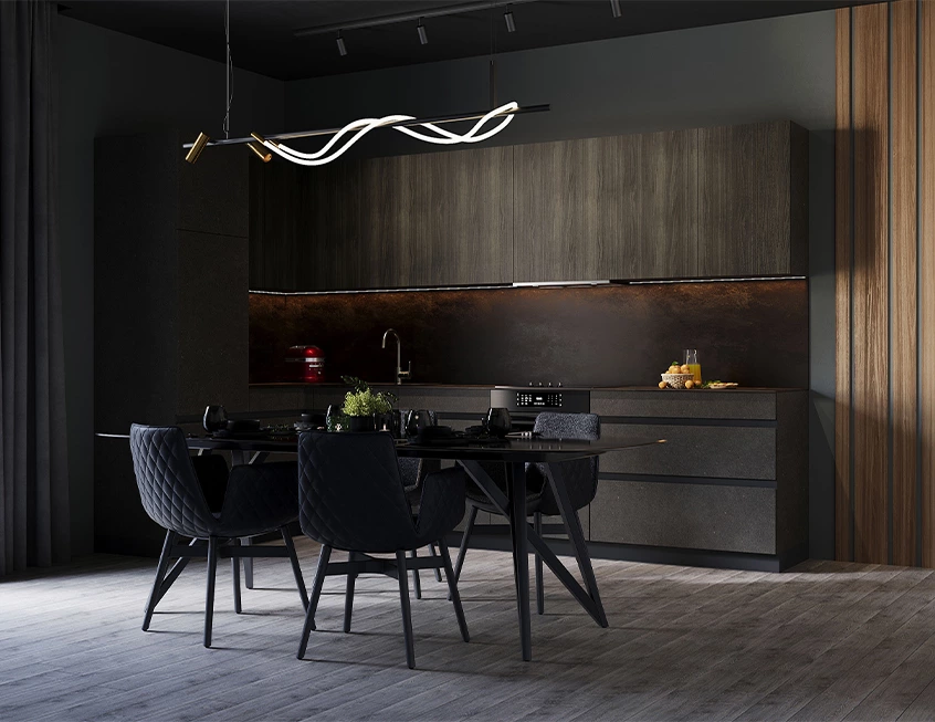 This L-shaped kitchen cabinet set takes advantage of a small area by marrying streamlined form with functional storage options. It features rich dark tones and contrasting textures, bringing an organic look that's as grit as it is luxurious.