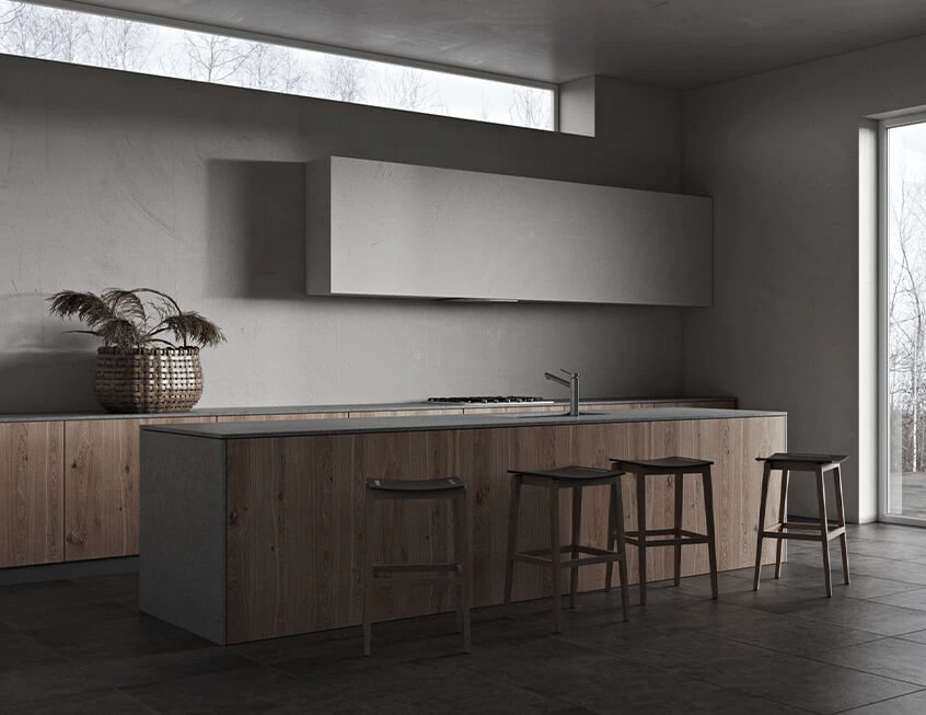 Wood and grey are common in cabinet design but when putting them together, the result is always striking. This combo creates a rustic feel due to the material texture but also owns a simple yet strong contrast pleasing the eye.