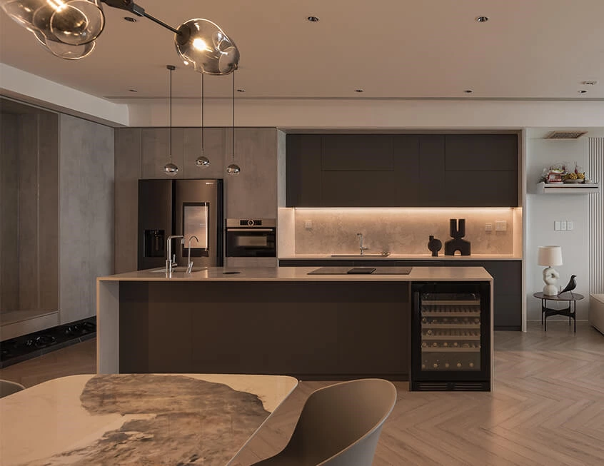 This open kitchen features I-shaped closed cabinetry with a waterfall island for maximized expansiveness and spatial utilization. From the sub sink, pop-up socket to wine storage, the versatile island can well serve your kitchen work and gatherings. The contrasting shades of grey create an instant effect of a sophisticated, understated modern aesthetics.