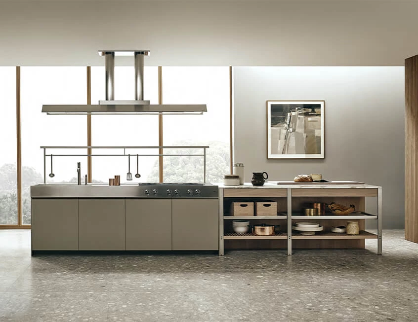 The overall color palette leans towards low saturation with a metallic sheen, which cultivates a high-end and professional kitchen.